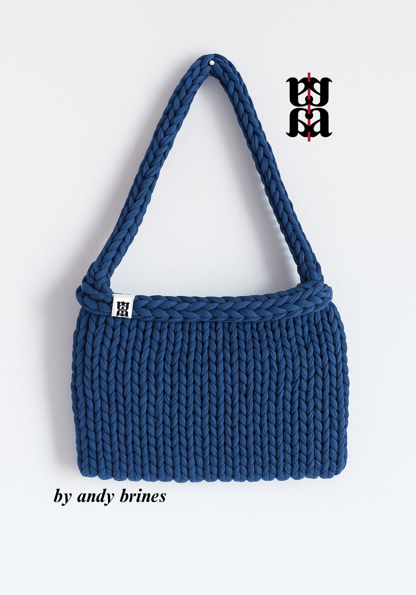 Está es una bag que se teje en punto Jersey de abajo hacia arriba. Con un montaje tejido doble. La parte superior está tejida en un i-cord igual que la asa, es de líneas simples construida en una sola pieza.